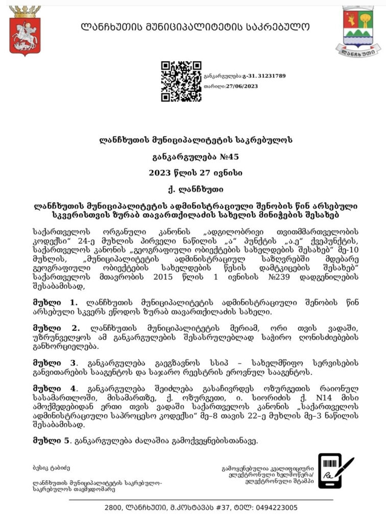 „არასწორი ინფორმაციაა, ლანჩხუთის მუნიციპალიტეტის ადმინისტრაციული შენობის წინ მდებარე სკვერს ზურაბ თავართქილაძის სახელი საკრებულოს 2023 წლის 27 ივნისის განკარგულების თანახმად მიენიჭა. საკრებულოს შესაბამისი კომისიის ინიციატივით, მალე დამზადდება სათანადო დაფაც წარწერით. კარგი იქნებოდა, ნიუსის დაწერამდე გარკვეულიყო სიმართლე“ _ წერს „გურია თუდეის“ კომენტარების ველში ნინო მშვიდობაძე და ლანჩხუთის საკრებულოს გადაწყვეტილების ე.წ. სქრინშოტს აქვეყნებს.